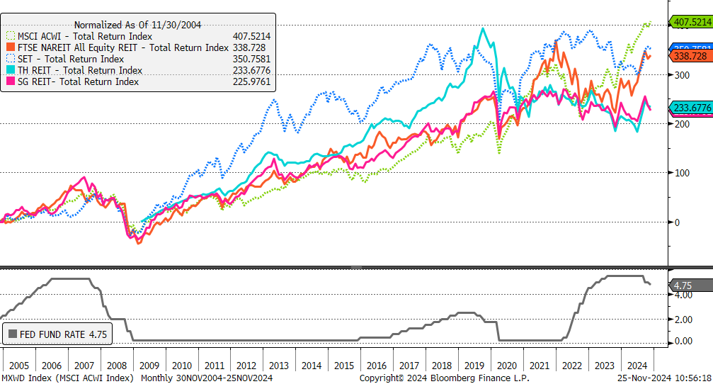 • Logistic REITs: คลังสินค้าและศูนย์กระจายสินค้ายังเป็นที่ต้องการสูง โดยเฉพาะในเอเชียและอเมริกาเหนือจะเป็นปัจจัยสนับสนุนหลักต่อการดำเนินงานของกลุ่มนี้ ผลตอบแทนระยะยาวคาดว่าจะอยู่ที่ 8–10% ต่อปี