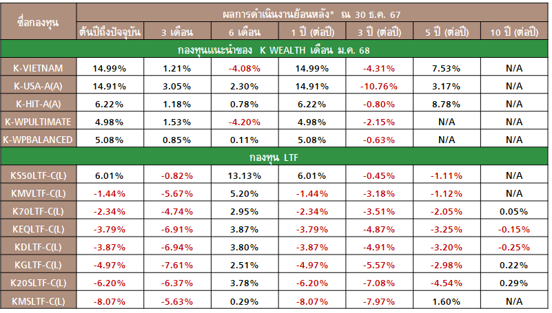 ผู้ลงทุนสามารถเลือกกองทุนที่ต้องการลงทุนได้จากกองทุนแนะนำของ K WEALTH ประจำเดือน ม.ค. 68 ซึ่งผลการดำเนินงานย้อนหลัง* ณ 30 ธ.ค. 67 ส่วนใหญ่สูงกว่ากองทุน LTF เช่น