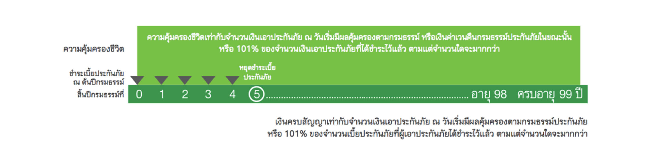 ตัวอย่างเช่น มีเงินครบจากกองทุน LTF จำนวน 150,000 บาท สำหรับผู้ชายอายุ 60 ปี หากนำไปทยอยเป็นค่าเบี้ยประกันชีวิตเพื่อคุ้มครองตลอดชีพ 99/5 ปีละ 30,000 บาท (โดยค่าเบี้ยปีที่ 2-5 แนะนำพักไว้ในกองทุน K-SF-A) จะสามารถสร้างความคุ้มครองชีวิตได้ประมาณ 190,000 บาท นับตั้งแต่วันที่กรมธรรม์อนุมัติ หรือแม้ไม่ได้เสียชีวิต เบี้ยประกันที่จ่ายไปก็ถูกสะสมไว้ในรูปแบบของมูลค่าเงินเวนคืน หรือเมื่อครบสัญญาตอนอายุ 99 ปี ก็จะได้รับเงินก้อนเท่ากับทุนประกันเริ่มต้น หรือกรณีนี้คือประมาณ 190,000 บาท ซึ่งสูงกว่าค่าเบี้ยประกันรวมที่จ่ายไปประมาณ 40,000 บาท