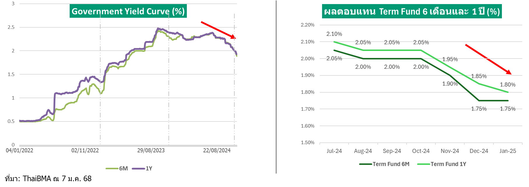 แนวโน้มดอกเบี้ยของไทยเข้าสู่สภาวะดอกเบี้ยขาลง หลังจากที่คณะกรรมการนโยบายการเงิน (กนง.) มีมติในการลดอัตราดอกเบี้ยนโยบายลง 0.25% ในการประชุมเดือน ตุลาคม 2567 ส่งผลให้อัตราดอกเบี้ยจากเดิมที่อยู่ระดับ 2.50% สู่ระดับ 2.25% แน่นอนว่าจะส่งผลต่อดอกเบี้ยเงินฝากรวมถึงการลงทุนในกองทุน Term Fund ที่จะได้ผลตอบแทนเป็นดอกเบี้ยเมื่อครบกำหนดอายุ ซึ่งก็ต้องยอมรับว่าเป็นตัวเลือกในการหาผลตอบแทนที่ได้รับความนิยมจากนักลงทุนไทย เนื่องจากเป็นการลงทุนที่มีความเสี่ยงต่ำ และได้ผลตอบแทนที่แน่นอน อย่างไรก็ตามในสภาวะที่อัตราดอกเบี้ยอยู่ในช่วงขาลงนั้น ทั้งอัตราดอกเบี้ยเงินฝากและกองทุน Term Fund อาจเผชิญกับความท้าทายที่สำคัญจาก ผลตอบแทนที่มีแนวโน้มลดลง (ภาพที่ 1) จะเห็นได้ว่าหลังจากที่ กนง. ได้ปรับลดอัตราดอกเบี้ยนโยบายลง อัตราผลตอบแทนพันธบัตร (ภาพซ้าย) มีแนวโน้มที่ลดลงอย่างชัดเจน และยังส่งผลต่อผลตอบแทนของกองทุน Term Fund (ภาพขวา) เนื่องจากอัตราดอกเบี้ยของตราสารหนี้ที่ออกใหม่ซึ่งกองทุน Term Fund เข้าลงทุน มักต่ำกว่าอัตราดอกเบี้ยของตราสารหนี้ที่ครบกำหนดเดิม