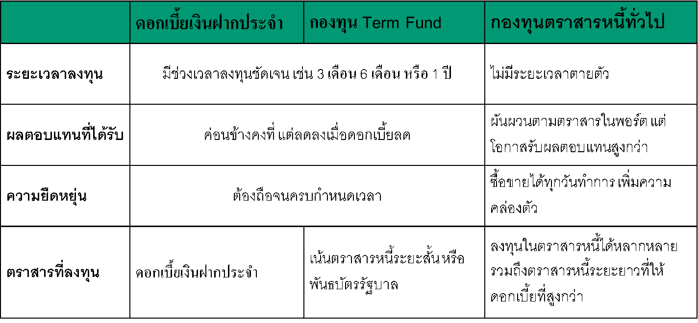 จะเห็นได้ว่าทั้งการลงทุนในดอกเบี้ยเงินฝาก กองทุน Term Fund หรือกองทุนรวมตราสารหนี้ทั่วไปนั้นมีจุดเด่นที่ไม่เหมือนกันขึ้นอยู่กับวัตถุประสงค์การลงทุนของแต่ละคน หากพิจารณาเรื่องสภาวะแวดล้อมของตลาดตราสารหนี้ที่เป็นอยู่ ณ ปัจจุบันก็ต้องยอมรับว่ากองทุนตราสารหนี้นั้นเป็นตัวเลือกที่เหมาะสมกว่า เพราะมีความหลากหลายของตราสารหนี้ที่ลงทุน รวมถึงจะได้ประโยชน์จากราคาตราสารหนี้ที่มีโอกาสเพิ่มขึ้น หาก กนง. มีการปรับลดอัตราดอกเบี้ยต่อในปีนี้