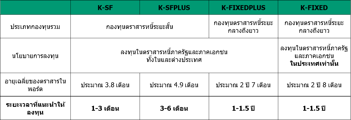 ปัจจุบันกองทุนตราสารหนี้นั้นมีหลากหลายประเภททั้งกองทุนตราสารหนี้ระยะสั้น ระยะกลาง และระยะยาว แตกต่างกันไป แต่วันนี้ทาง K Wealth ได้เลือกมาให้นักลงทุนพิจารณาตามเป้าหมายการลงทุน และระยะเวลาการลงทุนที่เหมาะสม (ภาพที่ 3) ทั้งการลงทุนในระยะสั้นตั้งแต่ 1 เดือนขึ้นไป จนถึงระยะกลางถึงยาว ที่มีระยะเวลาลงทุนได้ไม่ต่ำกว่า 1 ปี