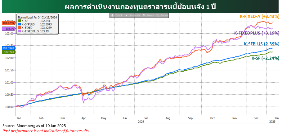 ในส่วนของผลตอบแทนของกองทุน (ภาพที่ 4) จะเห็นได้ว่า ทั้งกองทุน K-SF และ K-SFPLUS นั้นสามารถสร้างผลตอบแทนได้อย่างสม่ำเสมอ มีความผันผวนค่อนข้างน้อย เนื่องจากอายุเฉลี่ยของตราสารหนี้ที่ทั้ง 2 กองทุนไปลงทุนนั้นค่อนข้างสั้น (ไม่เกิน 1 ปี) ซึ่งจะได้รับผลกระทบจากการเคลื่อนไหวของอัตราผลตอบแทนพันธบัตร (Yield Curve) ค่อนข้างจำกัด ซึ่งแตกต่างจาก กองทุน K-FIXED และ K FIXEDPLUS ที่เป็นกองทุนตราสารหนี้ระยะกลางถึงยาว โดยมีอายุมีเฉลี่ยของตราสารหนี้มากกว่า 1 ปี มีการเคลื่อนไหวที่ผันผวนกว่า แต่ก็สามารถสร้างผลตอบแทนได้อย่างน่าสนใจ และยิ่งในช่วงที่วัฏจักรดอกเบี้ยเป็นขาลงนั้น ยิ่งส่งผลดีต่อกองทุนตราสารหนี้ระยะกลางถึงยาวขึ้นไปอีก