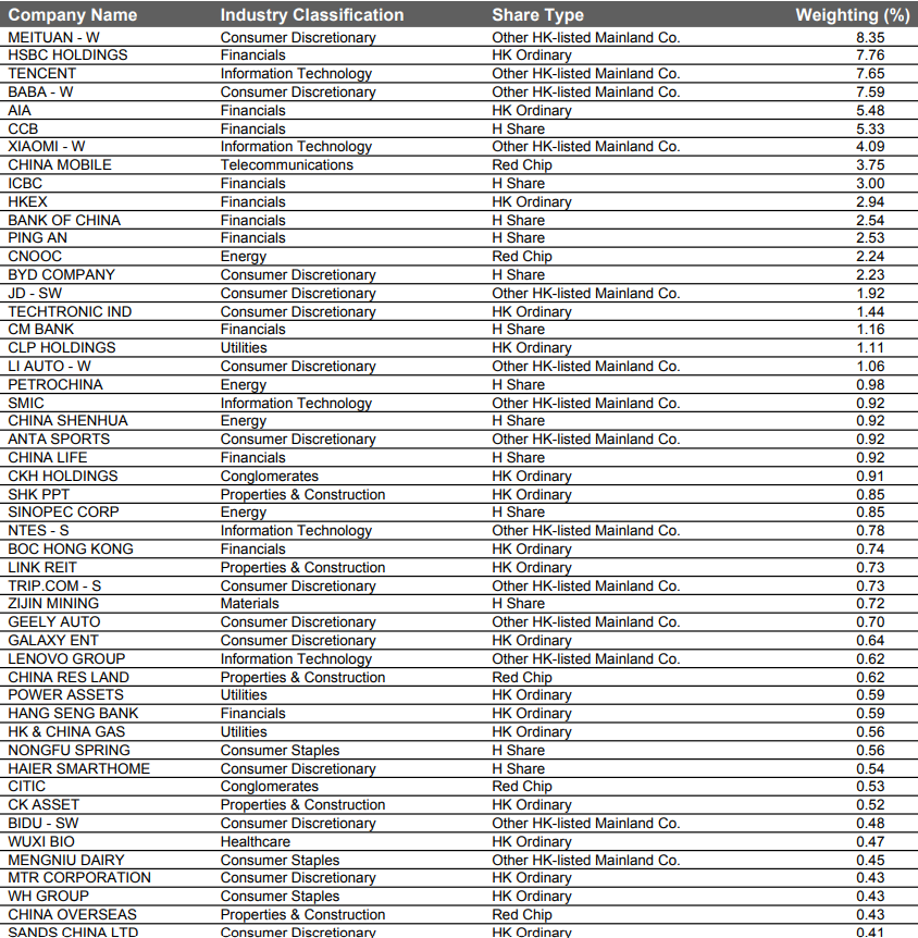 รายชื่อหุ้น 50 ตัวแรกในดัชนีฮั่งเส็ง