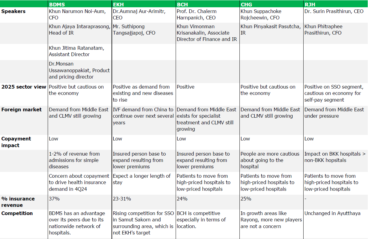 ในมุมมองของ KS มองว่า แผน Copayment ใหม่ ที่จะเริ่มบังคับใช้ในเดือนมีนาคม 2568 เป็นความท้าทายสำหรับบริษัทประกันในการออกแบบกรมธรรม์ที่น่าสนใจ และมีแนวโน้มเปลี่ยนพฤติกรรมผู้บริโภคให้ลดการใช้บริการสุขภาพที่ไม่จำเป็น อย่างไรก็ดี ผู้บริหารโรงพยาบาลเอกชนชั้นนำหลายแห่งให้ข้อมูลว่าผลกระทบจากแผน Copayment ต่อรายได้ประกันของบริษัทค่อนข้างน้อย เช่น BDMS เปิดเผยว่าผลกระทบคาดจะอยู่ราว 1-2% ของรายได้รวม