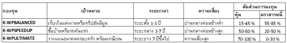 - กองทุน K-WPSPEEDUP ความเสี่ยงปานกลางค่อนข้างสูง เติบโตพอประมาณ พร้อมรับความผันผวน จากสัดส่วนในหุ้นประมาณ 50-80%