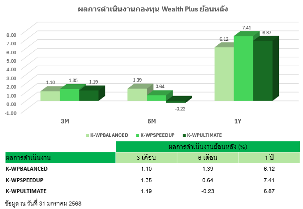 ในปี 2567 กองทุนผสม K-WealthPLUS Series เผชิญกับความท้าทายหลายประการที่ส่งผลต่อผลการดำเนินงานจากความผันผวนของตลาดการเงินโลกที่เกิดจากความตึงเครียดทางการเมืองระหว่างประเทศ โดยเฉพาะในตะวันออกกลางระหว่างอิสราเอลและอิหร่านที่แม้สถานการณ์จะผ่อนคลายลงแล้ว แต่ยังคงเป็นปัจจัยที่นักลงทุนต้องติดตามอย่างใกล้ชิด หรือเหตุการณ์ Black Monday ในเดือนสิงหาคม ที่ส่งผลให้ตลาดหุ้นทั่วโลกปรับตัวลดลงอย่างรวดเร็วจากความกังวลเกี่ยวกับภาวะเศรษฐกิจถดถอยในสหรัฐฯ และการปรับขึ้นดอกเบี้ยของธนาคารกลางญี่ปุ่น (BOJ) ล้วนแล้วเป็นปัจจัยกดดันผลการดำเนินงานของกองทุนผสม K-WealthPLUS Series รวมถึงตลาดการเงินทั่วโลก แม้ต้องเผชิญกับปัจจัยที่ไม่ได้คาดคิด แต่กองทุนผสม K-WealthPLUS Series ยังสามารถสร้างผลตอบแทนได้ดี โดยอ้างอิงจากผลการดำเนินงานย้อนหลัง 1 ปี (ณ วันที่ 31 มกราคม 2568) K-WPBALANCED +6.12%, K-WPSPEEDUP +7.41% และ K-WPULTIMATE +6.87%