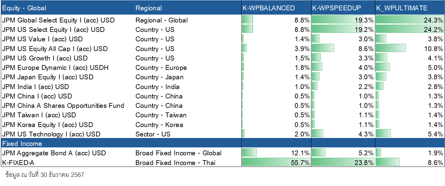 - กองทุน K-WPULTIMATE ที่มีสัดส่วนในหุ้นประมาณ 70-100% เน้นการเติบโตโอกาสสร้างผลตอบแทนสูงขึ้น แต่ต้องรับความเสี่ยงจากตลาดหุ้นได้