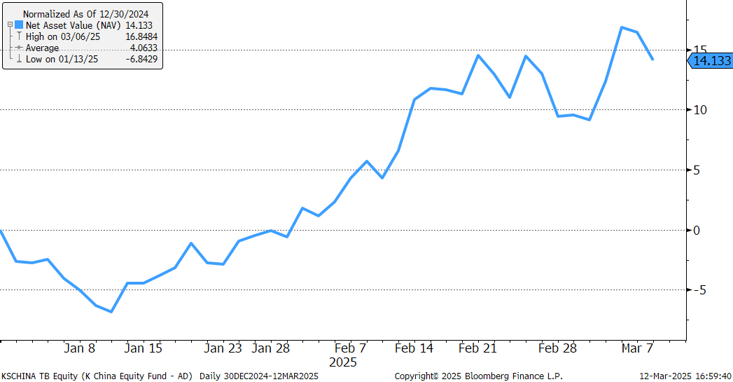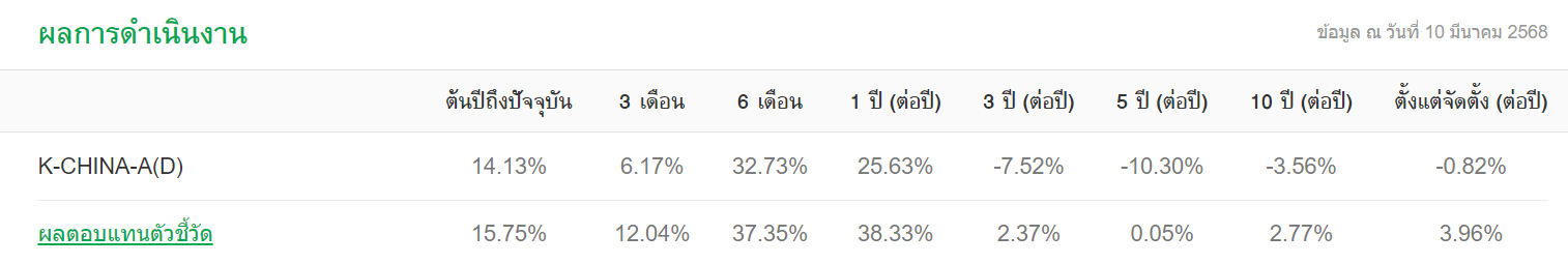 กราฟผลตอบแทนกอง K-CHINA ตั้งแต่ต้นปีถึงวันที่ 10 มีนาคม 2025