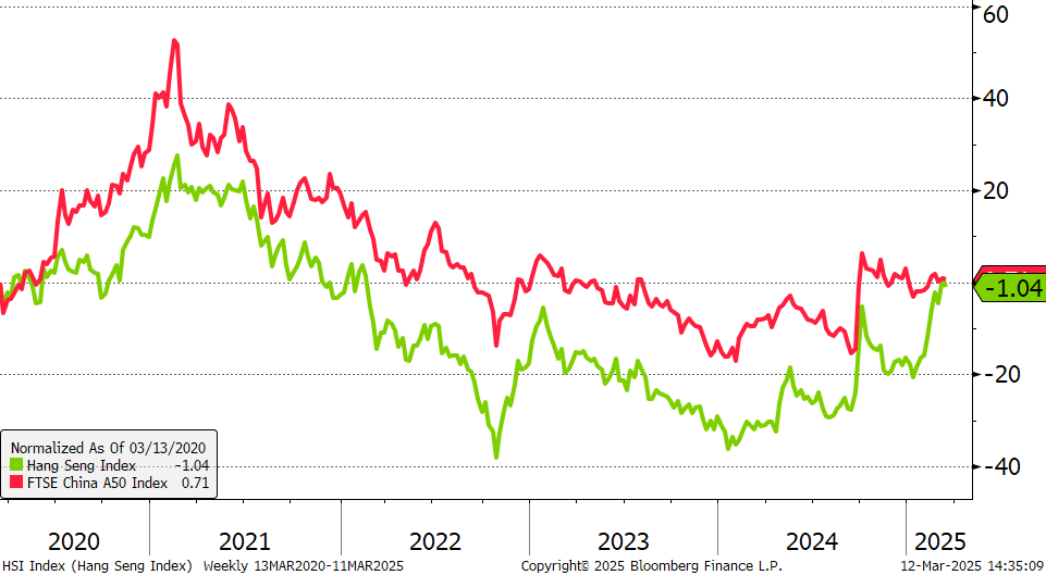 เมื่อเปรียบเทียบระหว่าง ตลาด A-Share ที่ลงทุนในจีนแผ่นดินใหญ่ หรือบริษัทภายในประเทศจีนที่อาจไม่จดทะเบียนในต่างประเทศ เช่น บริษัทในกลุ่มสินค้าอุปโภคบริโภค ธนาคาร ทรัพยากรธรรมชาติ และเทคโนโลยีบางส่วนที่มุ่งตลาดจีนเป็นหลัก กับตลาด H-Share ที่มีบริษัทขนาดใหญ่ที่มีการดำเนินธุรกิจข้ามพรมแดนหรือมีความเชื่อมโยงกับตลาดต่างประเทศมากขึ้น เช่น สถาบันการเงินขนาดใหญ่ ธนาคารรัฐวิสาหกิจ ผู้ให้บริการเครือข่ายมือถือ และบริษัทเทคโนโลยีบางส่วน จะเห็นว่าตั้งแต่เริ่มปี 2025 มา ตลาด H-Share มีศักยภาพในการฟื้นตัวที่เร็วกว่า