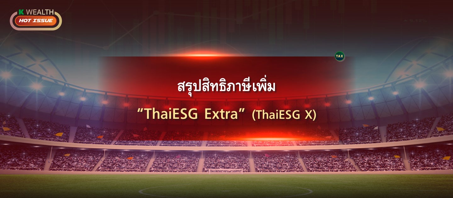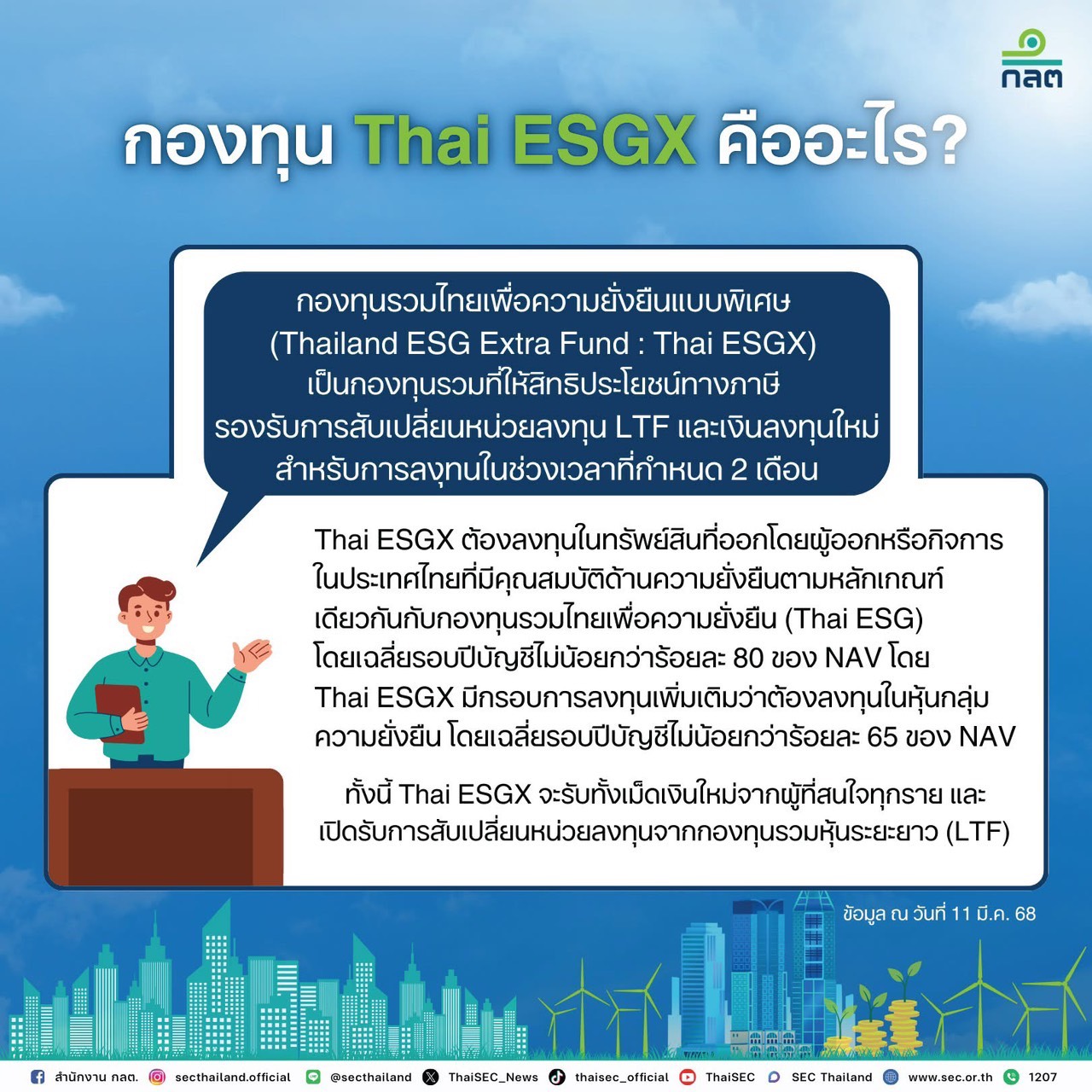 Thai ESG Extra หรือ Thai ESGX คือกองทุนรวมกลุ่มใหม่ในหมวด “Thai ESG” ที่มุ่งเน้นลงทุนในหลักทรัพย์หรือธุรกิจที่ให้ความสำคัญกับปัจจัยด้านสิ่งแวดล้อม สังคม และการกำกับดูแลกิจการที่ดี (ESG) เช่นเดียวกับกองทุน Thai ESG ที่มีอยู่เดิม* แต่เพิ่มเงื่อนไขพิเศษด้านสิทธิประโยชน์ทางภาษีขึ้นมาเป็นการเฉพาะในช่วงเวลาที่กำหนด ซึ่งมีเป้าหมายสำคัญสองประการคือ