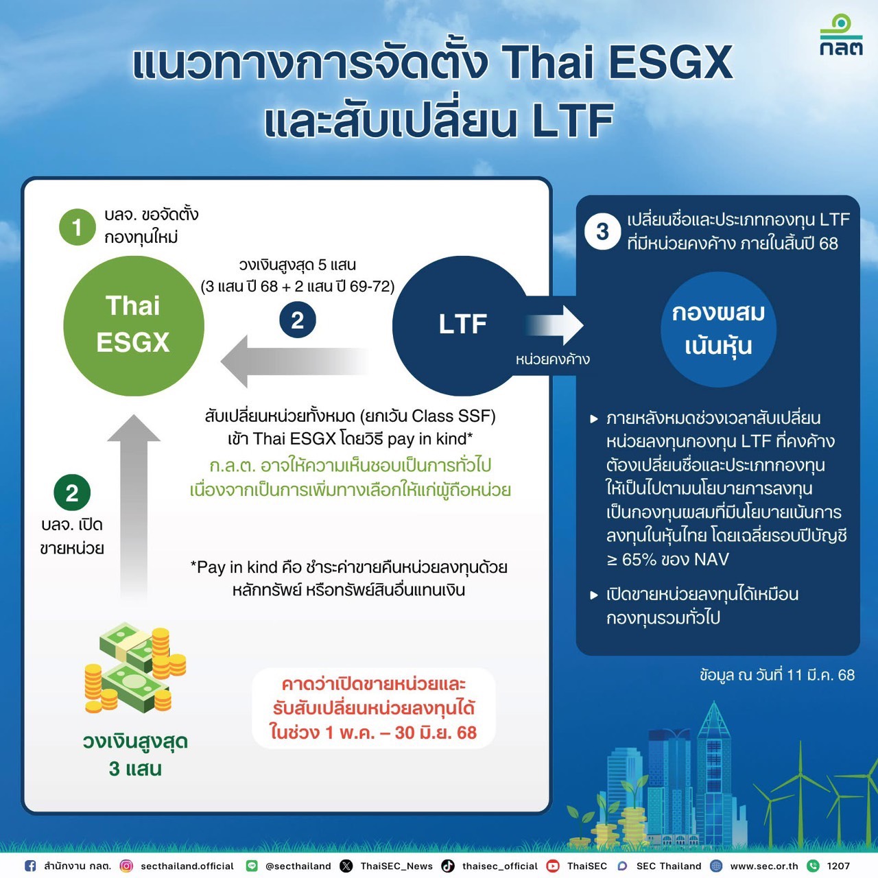ขณะเดียวกัน การลงทุนในรูปแบบ LTF (Long-Term Equity Fund) เก่า ได้ครบกำหนดการถือครองตามเงื่อนไขทั้งหมดในปีนี้ ได้สร้างแรงกดดันให้เกิดการเทขายหน่วยลงทุนในตลาดหุ้น ส่งผลให้ สำนักงานคณะกรรมการกำกับหลักทรัพย์และตลาดหลักทรัพย์ (ก.ล.ต.) ร่วมกับหน่วยงานที่เกี่ยวข้อง ออกแนวทางใหม่ “Thai ESG Extra” หรือ “Thai ESGX” เพื่อจูงใจให้นักลงทุนต่อยอดหรือโยกย้ายเงินลงทุน LTF เก่าให้คงอยู่ในตลาดหุ้นไทยต่อไป อีกทั้งยังสนับสนุนให้นักลงทุนหันมาให้ความสำคัญกับการลงทุนแบบยั่งยืนด้าน ESG ไปพร้อม ๆ กัน
