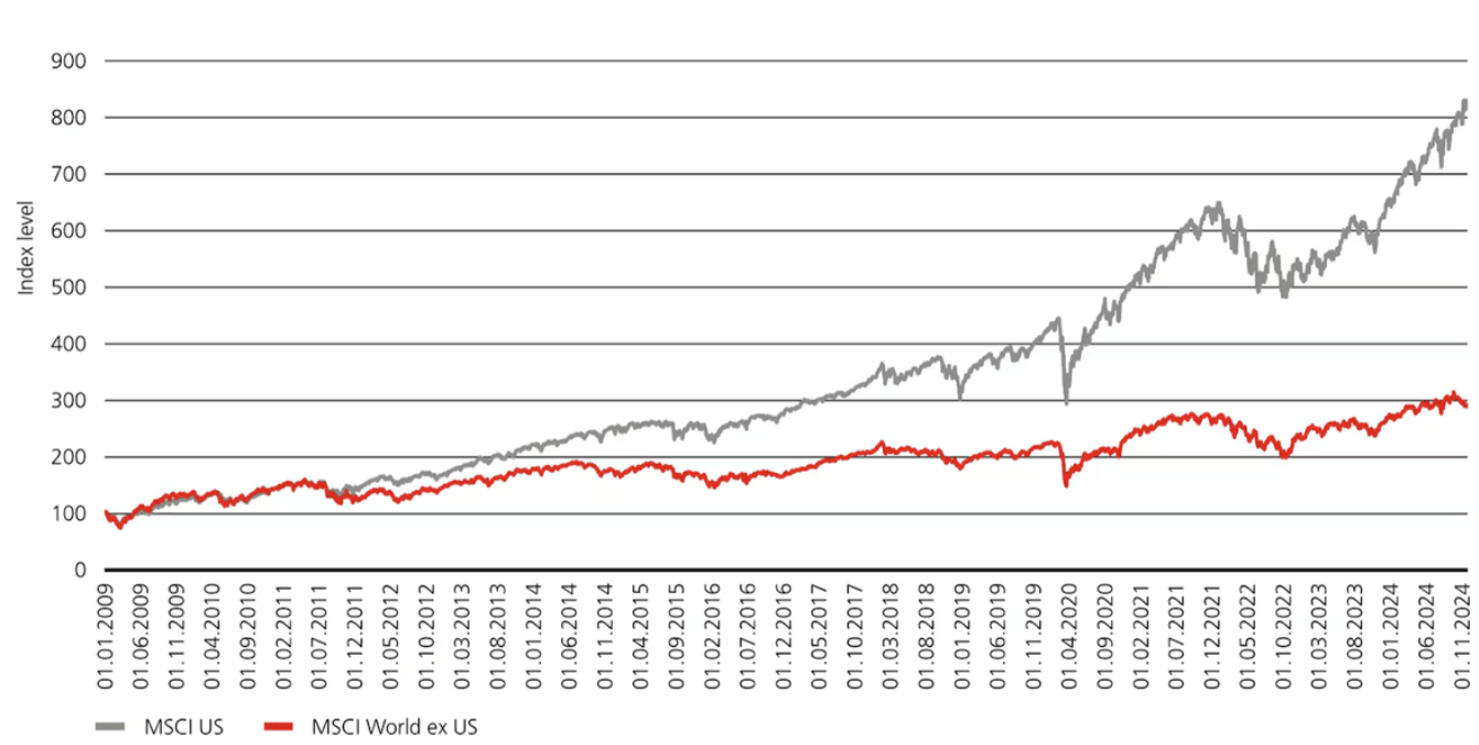 รูป 1 : แสดงผลตอบแทนรวมของดัชนี MSCI USA เทียบกับ ผลตอบแทนรวมดัชนี MSCI World ex US