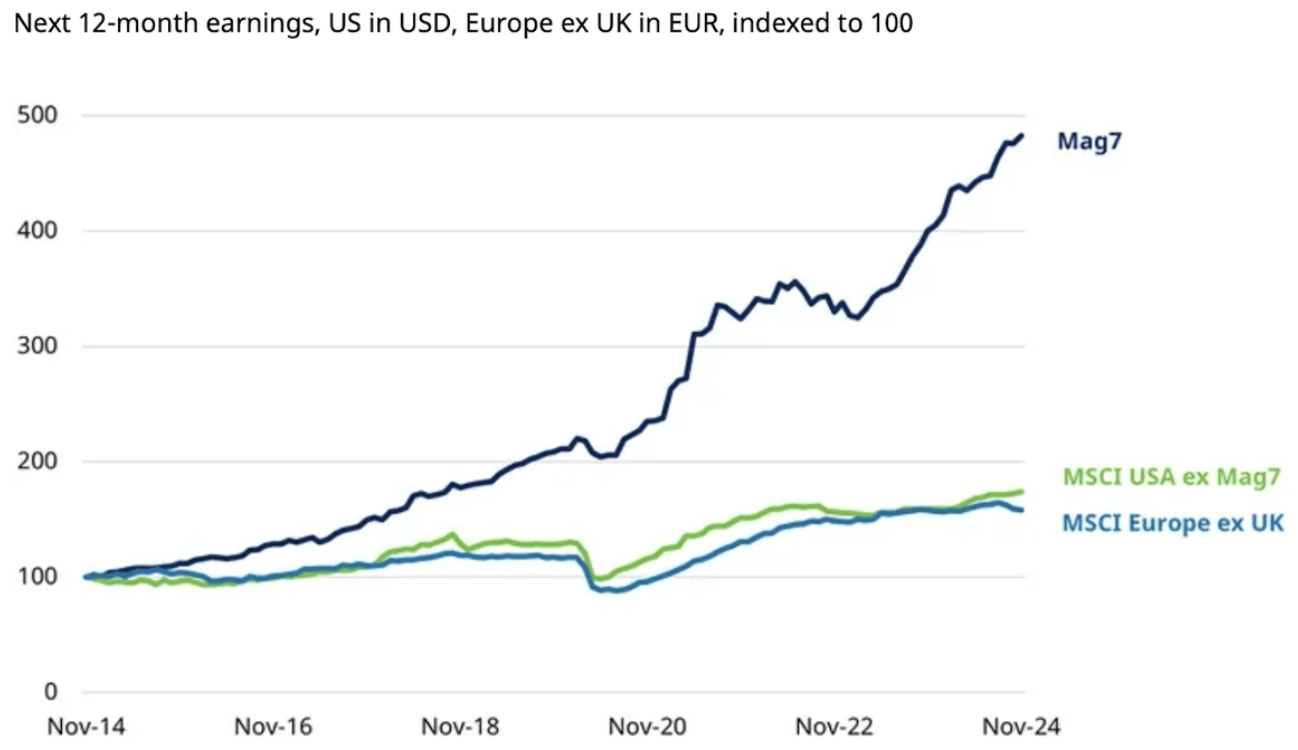 - กำไรเติบโตโดดเด่นเทียบกับตลาดอื่น : อ้างอิงข้อมูลจาก Financial Times จะเห็นว่า กำไรต่อหุ้นของบริษัทจดทะเบียนในสหรัฐฯ (ดัชนี S&P500) เติบโต 290% นับตั้งแต่ปี 2010-2024 โดดเด่นกว่าคู่แข่งอย่างยุโรป ซึ่งกำไรต่อหุ้นของบริษัทจดทะเบียน (ดัชนี MSCI Europe) เติบโตเพียง 60% ในช่วงเวลาเดียวกัน