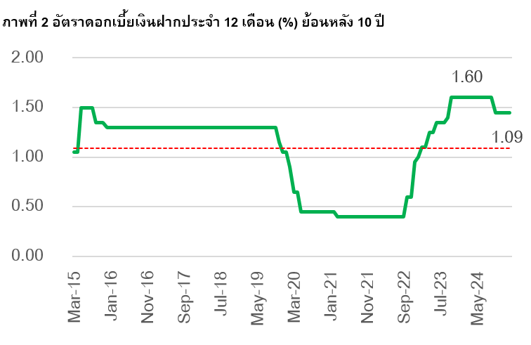 หากเรามาดูสถิติเพิ่มเติมในตารางที่ 1 จะเห็นว่ากองทุนตราสารหนี้ K-FIXED-A จากบลจ.กสิกรไทย ทำผลตอบแทนย้อนหลัง 10 ปีได้เฉลี่ย 1.96% ต่อปี ขณะที่เงินฝากประจำ 12 เดือนในรอบ 10 ปี ช่วงที่ดอกเบี้ยสูงสุดอยู่ที่เพียง 1.6% แต่หากดูตามกราฟด้านล่างแล้วเฉลี่ยอยู่เพียง 1.1% ขณะที่ช่วง Covid-19 ต่ำสุดได้แค่ประมาณ 0.5%