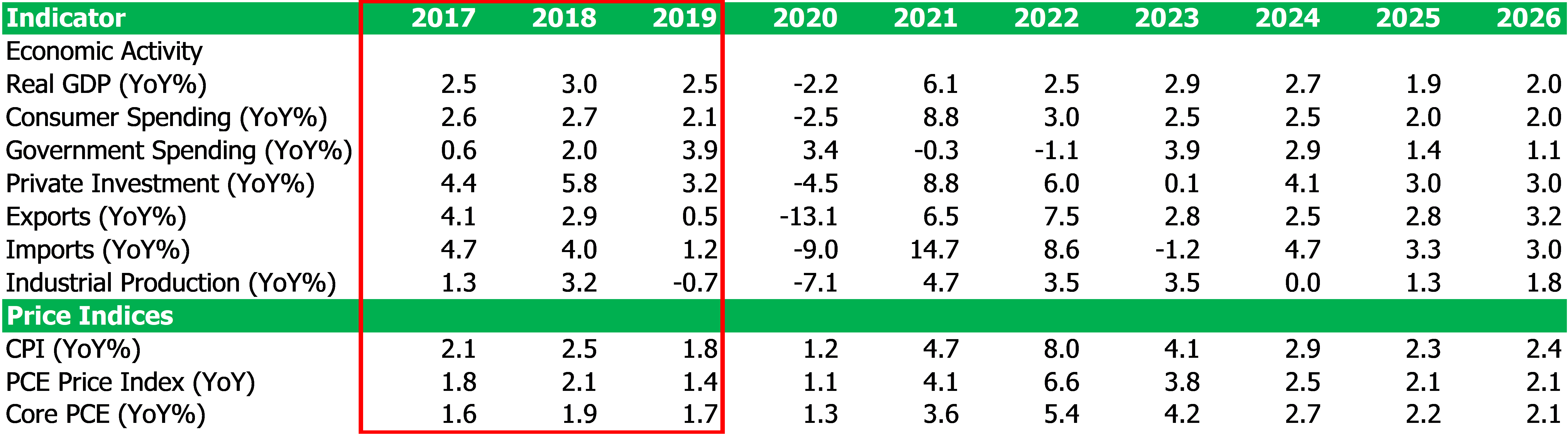 - ทิศทางดอกเบี้ยนโยบายที่ยังคงมีความไม่แน่นอน แม้ภาพเศรษฐกิจและการจ้างงานจะดูชะลอตัวลง แต่เงินเฟ้ออาจจะกลับขาเป็นขาขึ้นได้บนนโยบายภาษี ทำให้ผู้ว่าการ Fed คุณ Jerome Powell ไม่กล้าที่จะตัดสินใจลดดอกเบี้ย และตลาดหุ้นไม่ชอบความแน่นอนทำให้หุ้นปรับลงในช่วงที่ผ่านมา (ปกติเศรษฐกิจชะลอตัว การจ้างงานชะลอตัว = ลดดอกเบี้ย แต่ครั้งนี้ไม่เป็นไปตามสูตรสำเร็จนี้บนเรื่อง tariffs) ซึ่งถ้าไปดูผลลัพธ์ของนโยบายภาษีรอบแรกต่อตัวเลขเศรษฐกิจสำคัญของสหรัฐฯ ในช่วงปี 2017-2019 ไม่มีเรื่องไหนได้ดั่งใจ Trump เลย (ดูในกรอบสีแดง GDP ปรับลดลง ส่งออกลดลงแรง เงินเฟ้อขึ้นแต่ขึ้นไม่แรงมากนัก และตัวเลขกำลังการผลิตในช่วงหลาย 10 ปีที่ผ่านมาไม่เคยปรับตัวขึ้นแรงกว่าเพดานที่ 80%)