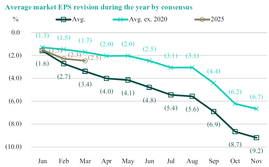 - ภาพด้านล่างคือข้อมูลที่ทาง K Securities ทำการเก็บสถิติย้อนหลัง 20 ปี พบว่าส่วนใหญ่นักวิเคราะห์ปรับประมาณการหุ้นไทยลงมากกว่าปรับขึ้น รอบนี้ (เส้นสีทอง) ก็เช่นเดียวกัน ปัจจุบันกำไรต่อหุ้นของตลาดที่นักวิเคราะห์ประมาณการไว้อยู่ที่แถว 95 จุด ซึ่งถือว่าใกล้เคียงกับจุดต่ำสุดที่ทาง KS มองไว้ที่ 93 จุดในไตรมาส 2/2025 โดยมองว่าหุ้นไทยโดนนักลงทุนทำโทษลงมาเยอะพอสมควร โดยเฉพาะหุ้นขนาดใหญ่ที่ลงมาซื้อขายในราคาระดับที่ถูกมากแล้ว ดังนั้นความเสี่ยงขาลงค่อนข้างจำกัด