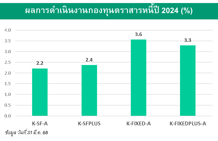 K WEALTH คาดว่าปี 2025 นี้ก็ยังถือได้ว่าเป็นปีที่ดีในการลงทุนกองทุนตราสารหนี้อยู่ โดยแนะนำให้ลงทุนในกองทุน K-SF-A และ K-SFPLUS สำหรับนักลงทุนที่เน้นสภาพคล่องและเป้าหมายผลตอบแทนดีกว่าเงินฝาก และกองทุน K-FIXED-A และ K-FIXEDPLUS สำหรับนักลงทุนที่มีเป้าหมายสร้างโอกาสได้ผลตอบแทนโดยรวมที่ดีในระยะยาว