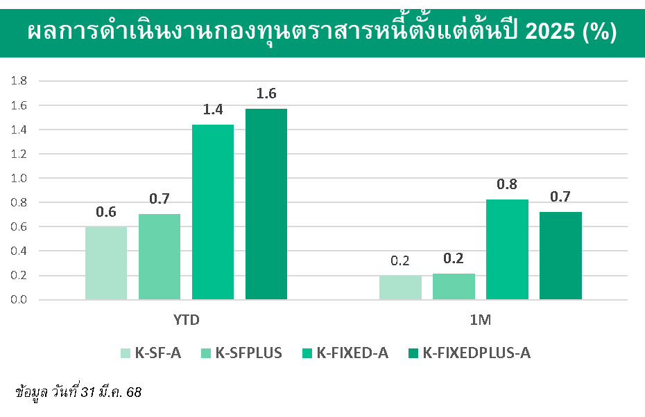 เข้าสู่ปี 2025 ตลาดการเงินทั่วโลกเผชิญกับความไม่แน่นอนจากสงครามการค้า ซึ่งส่งผลให้ตลาดหุ้นผันผวนหนักแต่ท่ามกลางความไม่แน่นอนเหล่านี้นักลงทุนจึงต้องการสินทรัพย์ที่มั่นคงมากขึ้น ส่งผลให้กองทุนตราสารหนี้ที่ทาง K WEALTH แนะนำยังสามารถสร้างผลตอบแทนได้ดีอย่างเนื่อง และยิ่งไปกว่านั้นหลัง กนง. ทำเซอร์ไพรส์ด้วยการลดดอกเบี้ยเร็วกว่าที่คาด ส่งผลให้ผลตอบแทนของกองทุนตราสารหนี้ที่เราแนะนำในช่วง 3 เดือนแรกของปี 2025 เป็นตามนี้