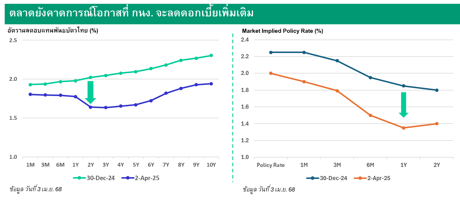 จะเห็นได้จากภาพด้านล่าง (ซ้าย) อัตราผลตอบแทนพันธบัตรปรับตัวลงอย่างต่อเนื่องซึ่งสะท้อนจากการคาดการณ์ลดดอกเบี้ยของตลาดที่เพิ่มมากขึ้นจากเดิมแค่ 1-2 ครั้งในปีนี้