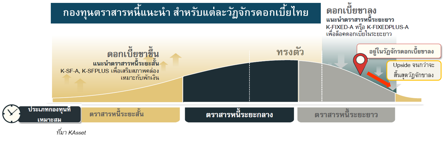 - เมื่ออัตราดอกเบี้ยกำลังเข้าสู่วัฏจักรขาขึ้น ควรเลือกลงทุนกองทุนตราสารหนี้ระยะสั้นอย่างเช่นกองทุน K-SF-A หรือ K-SFPLUS เนื่องจากการเพิ่มขึ้นของอัตราดอกเบี้ยจะทำให้ราคาของตราสารหนี้ลดลง แต่กองทุนที่มีอายุเฉลี่ยของตราสารที่สั้น (Duration) จะได้รับผลกระทบค่อนข้างน้อย ในทางกลับกันจะได้ประโยชน์จากตราสารเข้ามาใหม่ที่ผลตอบแทนเพิ่มขึ้น จึงเหมาะกับนักลงทุนที่ต้องการพักเงินระยะสั้น