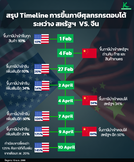 - นับตั้งแต่เดือนก.พ.เป็นต้นมาสหรัฐฯ เริ่มมีการใช้มาตรการกำแพงภาษี โดยในวันที่ 2 เม.ย. สหรัฐฯ ประกาศเก็บภาษีนำเข้าเกือบทุกประเทศทั่วโลก ยิ่งสร้างความปั่นป่วนต่อเศรษฐกิจและตลาดหุ้น อย่างไรก็ตามล่าสุด ปธน.ทรัมป์ประกาศว่าจะลดอัตราภาษีนำเข้าจากต่างประเทศส่วนใหญ่ ยกเว้นจีน ลงชั่วคราวเป็น 10% เป็นเวลา 90 วัน แต่สำหรับจีนนั้นการตอบโต้ระหว่างทั้งสองประเทศกลับยิ่งทวีความรุนแรง