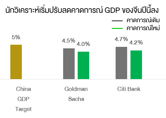 - นักวิเคราะห์เริ่มทยอยปรับลดคาดการณ์ GDP ของจีนปีนี้ลงจากผลกระทบของมาตรการภาษี Citi Bank คาดว่า GDP ของจีนปีนี้จะขยายตัวเหลือ 4.2% จากเดิม 4.7% ขณะที่ Goldman Sachs คาดว่า GDP จีนจะขยายตัวเหลือ 4% จากเดิม 4.5% ด้านทางการจีนได้เคยเปิดเผยเป้าหมายการขยายตัวของเศรษฐกิจปีนี้ที่ 5%