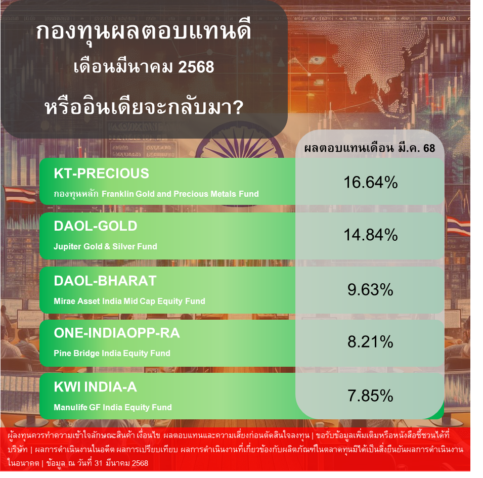ในเดือนมีนาคมตลาดหุ้นเริ่มผันผวนสูงขึ้น โดยเฉพาะหุ้นเทคฯ ที่เผชิญแรงขายทำกำไรจากความกังวลมาตรการภาษีของปธน.ทรัมป์ที่ประกาศออกมาเมื่อ 2 เมษายน 2568 โดยนอกจาก 5 กองทุนจากภาพข้างต้นแล้วกองทุนอื่นๆ ที่อยู่ใน Top 10 ผลตอบแทนดีเดือนมีนาคม 2568 ได้แก่ KFINDIA-A (+7.72%), KT-INDIA-A (+7.17%), ASP-INDIA-A (+7.16%), TISCOINA-A (+6.97%) และ SCBINDEQ(A) (+6.83%) กลุ่มอินเดียดูเหมือนจะแข็งแกร่งกว่าเพื่อน ด้าน K-INDIA-A ก็ไม่น้อยหน้า +6.78%