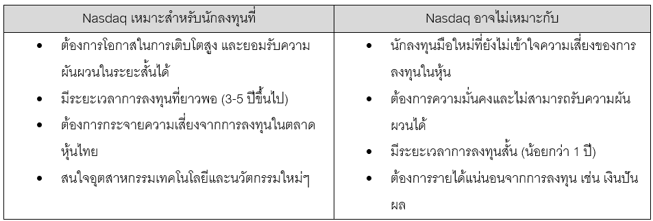 การกระจายความเสี่ยง ตลาดหุ้นไทยมีสัดส่วนของบริษัทในกลุ่มธนาคาร พลังงาน และค้าปลีกเป็นหลัก แต่มีบริษัทเทคโนโลยีค่อนข้างน้อย การลงทุนใน Nasdaq จึงช่วยกระจายความเสี่ยงไปยังกลุ่มอุตสาหกรรมที่ตลาดหุ้นไทยไม่มี