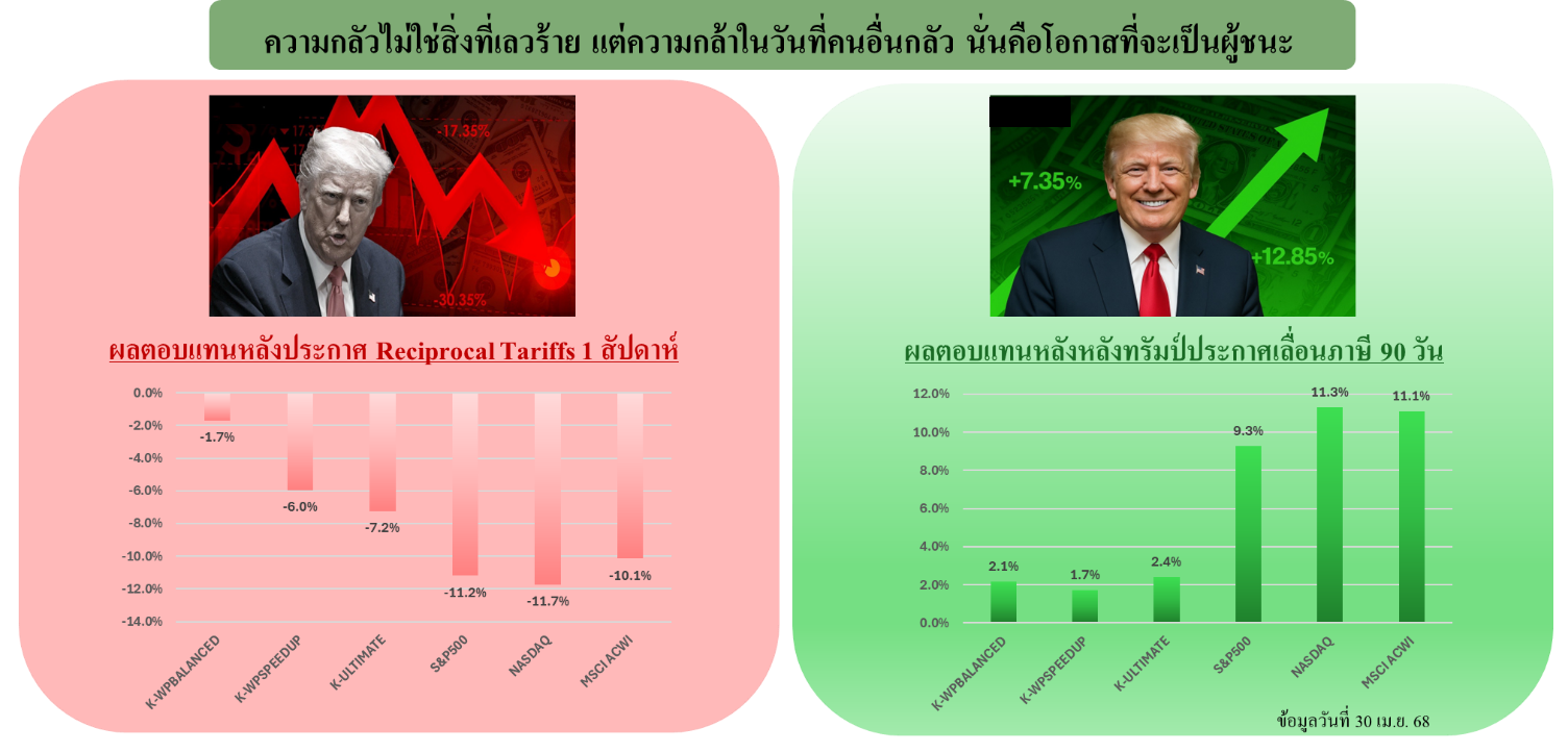 ภาพตลาดหุ้นทั่วโลกแดงฉานที่ติดตาใครหลายๆ คน หลังจากที่ประธานาธิบดี โดนัลด์ ทรัมป์ ประกาศขึ้นภาษีตอบโต้ (Reciprocal Tariffs) เมื่อวันที่ 2 เมษายน 2568 ส่งผลให้ตลาดหุ้นทั่วโลกปรับตัวลงรุนแรงที่สุดนับตั้งแต่วิกฤต COVID-19 สาเหตุหลักจากความกลัวของนักลงทุนต่อสงครามการค้าที่จะส่งผลให้เศรษฐกิจโลกถดถอย ทำให้หลายดัชนีที่สำคัญปรับตัวลงหลังจากทรัมป์ประกาศขึ้นภาษี 1 สัปดาห์ เช่น ดัชนี S&P500 (-11.2%), NASDAQ (-11.7%) รวมถึงดัชนีหุ้นโลก MSCI ACWI (-10.1%) กองทุน K WealthPLUS Series ก็ได้รับผลกระทบครั้งนี้เช่นกัน แต่ปรับตัวลงน้อยกว่าทุกดัชนีที่กล่าวถึงเมื่อซักครู่ทั้งหมด โดย K-WPBALANCED (-1.7%), K-WPSPEEDUP (-6.0%) และ K-WPULTIMATE (-7.2%) เป็นเพราะผู้จัดการกองทุนเฝ้าติดตามตลาดอย่างใกล้ชิด และมีการปรับลดความเสี่ยงของพอร์ตจากหุ้นสหรัฐฯ ไปยังตราสารหนี้ก่อนหน้านี้แล้ว
