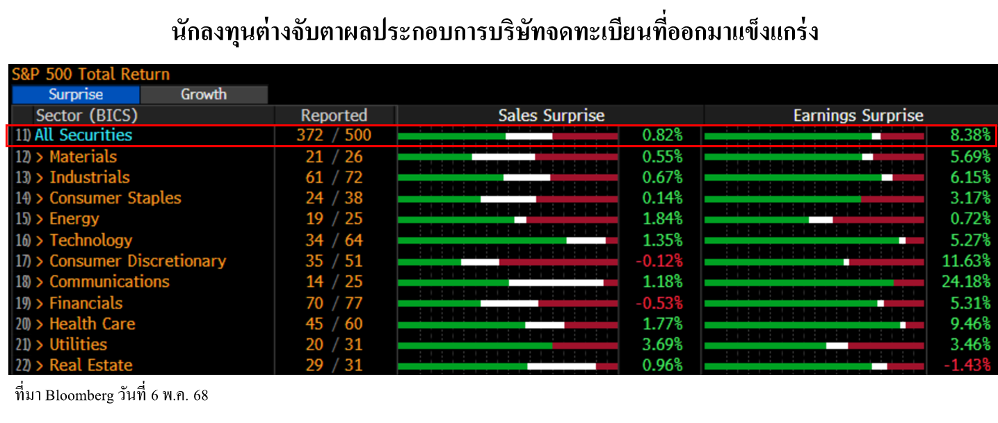ความกลัวของนักลงทุนเริ่มเบาบางลง หลังจากประธานาธิบดีโดนัลด์ ทรัมป์ เลื่อนการขึ้นภาษีนำเข้าสินค้าออกไปเป็นเวลา 90 วันเพื่อเปิดทางให้คู่ค้าประเทศต่างๆ ได้เข้ามาเจรจากับสหรัฐฯ เพื่อลดผลกระทบครั้งนี้ ส่งผลให้ตลาดหุ้นทั่วโลกตอบสนองในเชิงบวกอย่างรวดเร็ว ซึ่ง K WEALTH คาดว่าจะมีการทยอยประกาศผลการเจรจาที่มีแนวโน้มเชิงบวกต่อตลาดหุ้นออกมาเป็นระยะ และในขณะนี้ นักลงทุนหันไปติดตามผลประกอบการของบริษัทหุ้นสหรัฐฯ ที่ทยอยประกาศออกมา ซึ่งส่วนใหญ่ดีกว่าตลาดคาดไว้ ยิ่งตอกย้ำให้นักลงทุนมีความกล้าที่จะเข้ามาลงทุนในตลาดหุ้นมากขึ้น