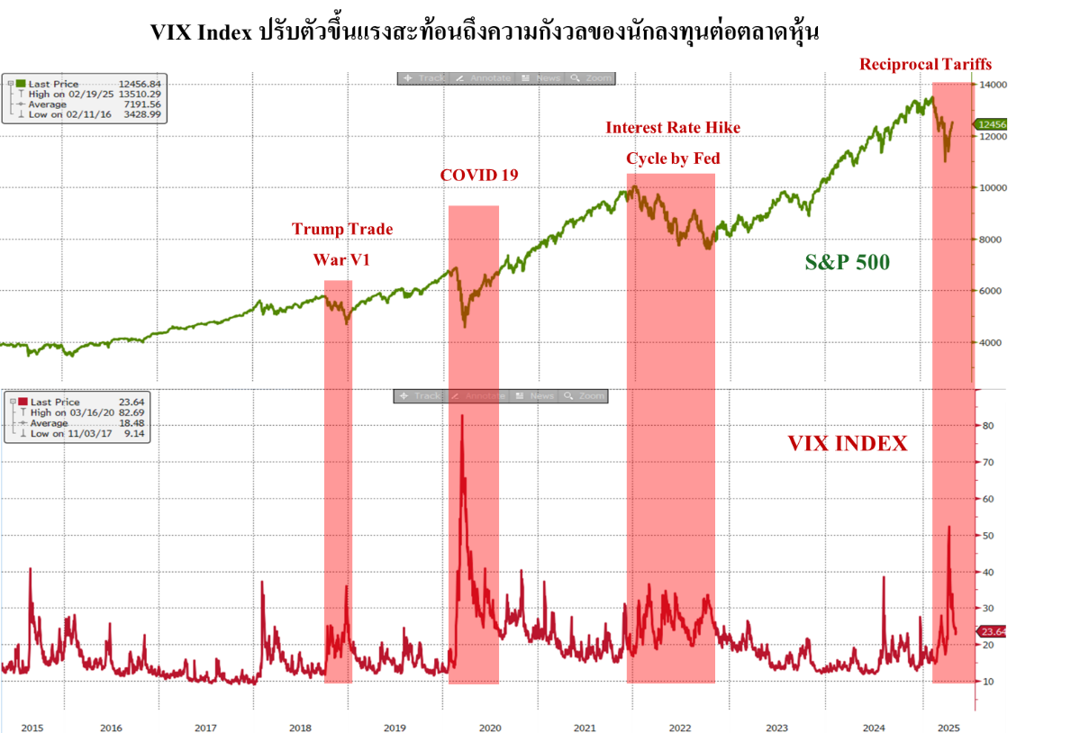 ทุกวิกฤตย่อมมีโอกาส เราดูได้จากในอดีตไม่ว่าจะเป็นสงครามการค้ารอบแรก วิกฤตการเงิน หรือวิกฤติ COVID-19 ที่เพิ่งผ่านมา สุดท้ายแล้วตลาดก็ฟื้นกลับมาได้ ดัชนี VIX Index เป็นตัวชี้วัดที่ตลาดใช้กันอย่างแพร่หลายในการดูว่านักลงทุนในตลาดมีความกล้าหรือกลัวในขณะนี้ โดยเมื่อดัชนีปรับตัวขึ้นแรง หมายความว่านักลงทุนเกิดความกลัวความไม่แน่นอน มักจะเกิดแรงเทขายในตลาดหุ้นตามมา ในทางกลับกันเมื่อตลาดสงบ VIX Index มักจะลงตาม และนักลงทุนจะกลับเข้าไปสู่ตลาดหุ้นอีกครั้ง จะเห็นได้ว่าปัจจุบัน VIX Index ได้ปรับลงมาใกล้ก่อนหน้านี้ ซึ่งจังหวะนี้ถือได้ว่าเป็นโอกาสที่จะรวบรวมความกล้าเข้ามาอยู่ในเกมส์การลงทุนอีกครั้ง ดังนั้น K WEALTH ยังคงแนะนำให้ทยอยเข้าลงทุนในกองทุน K-WealthPLUS Serires ตามระดับความเสี่ยงที่ยอมรับได้ของนักลงทุน ในระหว่างที่ตลาดกลับมาฟื้นตัวอีกครั้ง