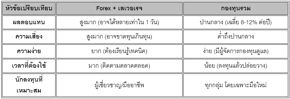 ตารางเปรียบเทียบ: Forex + เลเวอเรจ VS กองทุนรวม