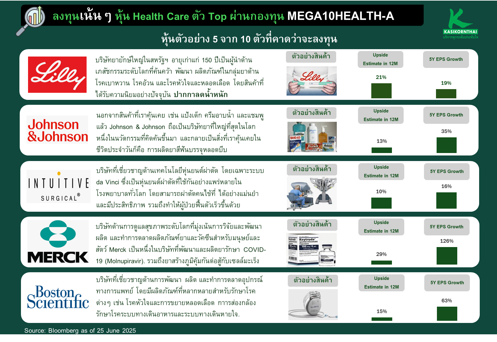 เพราะฉะนั้นการลงทุนบริษัทขนาดใหญ่ที่เป็นผู้นำในอุตสาหกรรม Healthcare ผ่านกองทุน MEGA10HEALTH-A ที่ยังคงมีการเติบโตในอนาคตทั้งจากแนวโน้มการรักษาสุขภาพรวมถึงการดูแลผู้สูงอายุที่เพิ่มขึ้น อีกทั้งยังไม่ผันผวนตามวัฎจักรเศรษฐกิจมากนัก เป็นอีกทางเลือกหนึ่งสำหรับนักลงทุนที่ต้องการสร้างผลตอบแทนระยะยาวผ่านการกระจายความเสี่ยงในหุ้น Healthcare คุณภาพ ที่คัดสรรโดยผู้จัดการกองทุนมืออาชีพ