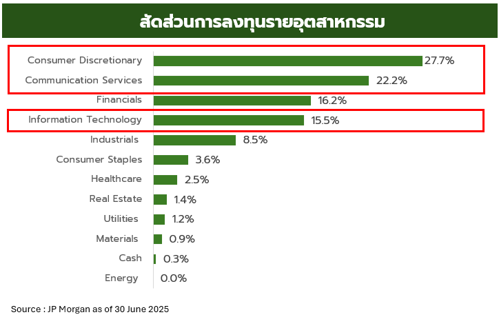 - ปัจจุบันกองทุนเน้นลงทุนในกลุ่ม Consumer Discretionary 27.7% , Consumer Services 22.2% และ Technology 15.5% คิดเป็นสัดส่วนรวมกันกว่า 65.4% ซึ่งเป็นกลุ่มที่ได้ประโยชน์จากมาตรการกระตุ้นเศรษฐกิจและมีแนวโน้มเติบโตสูง