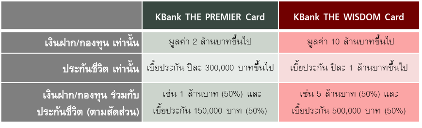 มีเงินฝากและเงินลงทุน รวมกันตั้งแต่ 2 ล้านบาทขึ้นไป แต่ไม่ถึง 10 ลบ. สามารถถือบัตรเอกสิทธิ์ KBank THE PREMIER Card