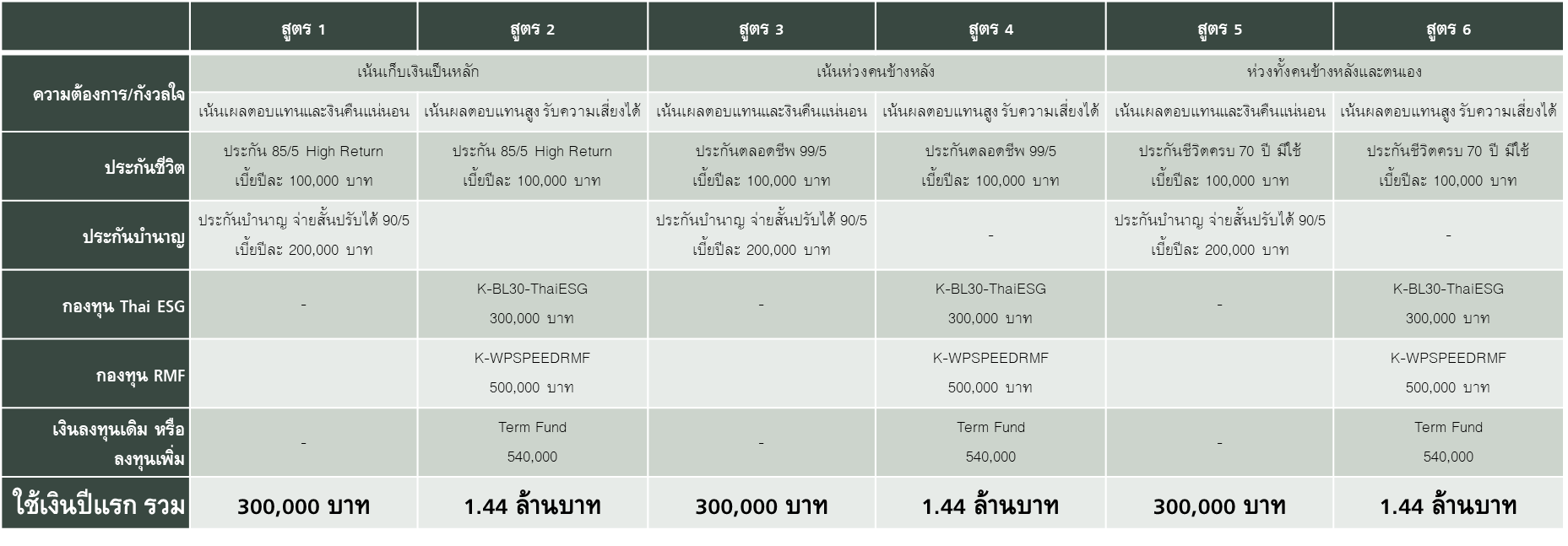 - หรือ ผู้ที่มีเงินฝาก/เงินลงทุน อยู่แล้วบางส่วน เช่น 1 ล้านบาท (50%) และเลือกซื้อประกันชีวิตเพิ่มอีก ด้วยเบี้ยประกันปีละ 150,000 บาท (50%)