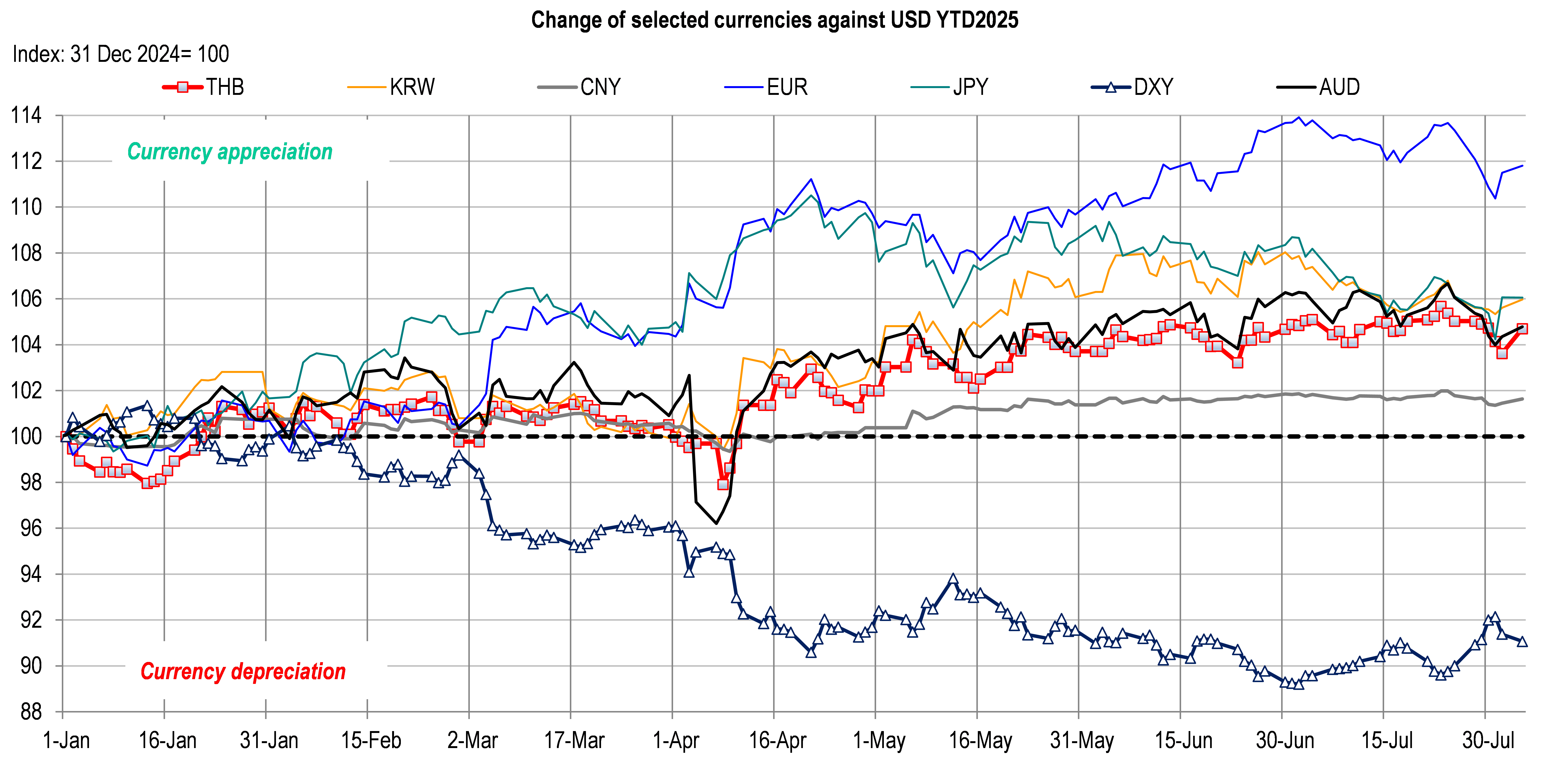 - ค่าเงินดอลลาร์ดูมีแนวโน้มอ่อนค่าอีก โดยเฉพาะหลังจากที่เห็นตัวเลขการจ้างงานสหรัฐฯ ของเดือน ก.ค. ที่ออกมาแย่กว่าตลาดคาดค่อนข้างมาก นอกเหนือจากปัจจัยเรื่องทรัมป์ทั้งภาษีการค้าและนโยบาย OBBBA (One Big Beautiful Bill Act) ที่ทำให้แนวโน้มหนี้สาธารณะของสหรัฐฯ ดูน่ากังวล ส่งผลให้ค่าเงินดอลลาร์ดูมีแนวโน้มจะอ่อนค่าอีก