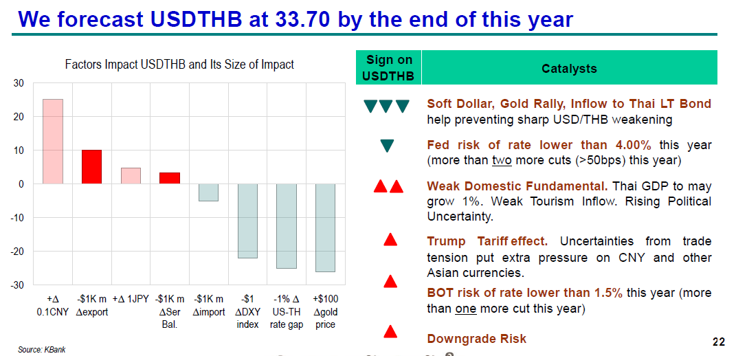 ทางห้องค้ากสิกรไทย (CMB) มีการปรับคาดการณ์ค่าเงินบาท ณ สิ้นปี 68 ไว้ที่ 33.7 บาทต่อดอลลาร์สหรัฐฯ ณ ก.ค. 68 (เดิมมองที่ 35.5 บาทต่อดอลลาร์สหรัฐฯ) แข็งค่าขึ้นเมื่อเทียบกับช่วงสิ้นปี 67 จาก