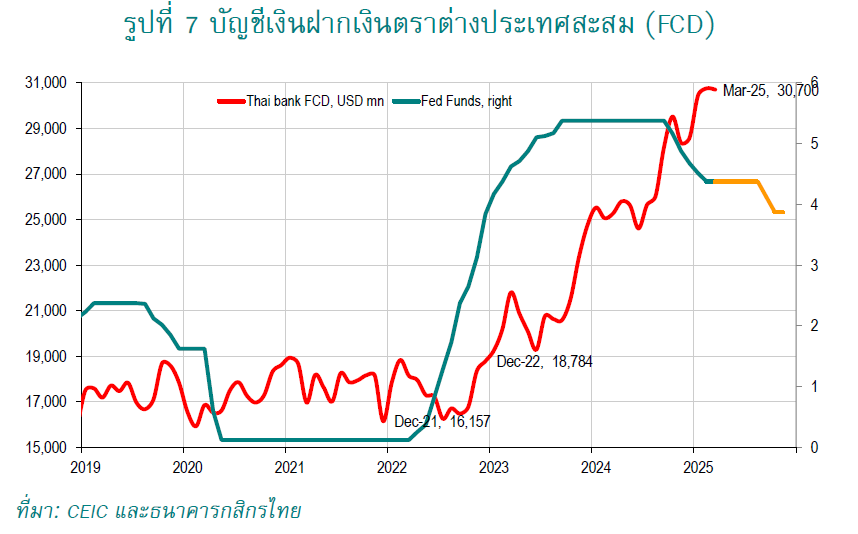 กระแสเงินฝากดอลลาร์ (FCD) ในไทย อ้างอิงข้อมูลจากห้องค้ากสิกรไทย เงินฝาก FCD พุ่งสูงขึ้นมาอยู่เหนือระดับ 30,000 ล้าน USD ในปี 2025 ถ้าคนแห่มาถอนเงินออกในภาวะที่เศรษฐกิจไทยอาจจะซบเซา คนต้องการสภาพคล่อง บวกกับแนวโน้ม Fed ลดดอกเบี้ยที่พูดถึงตอนต้น อาจทำให้เกิดแรงขายดอลลาร์ออกจากบัญชี FCD ก็จะทำให้บาทแข็งขึ้นอีก