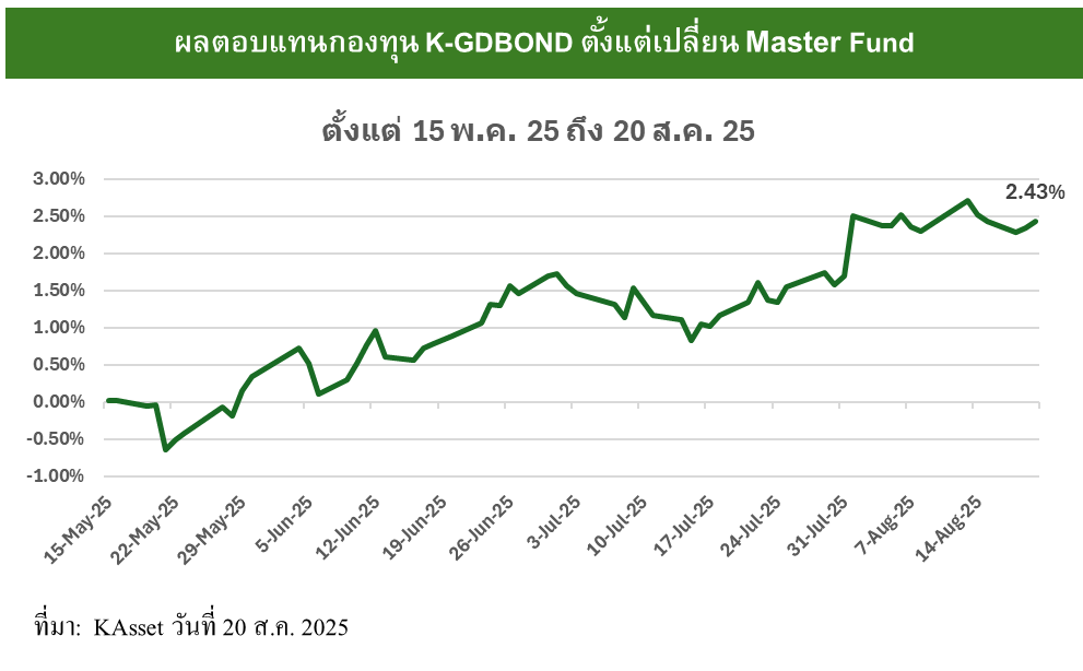 หลังมีการเปลี่ยนแปลง Master Fund ของกองทุน K-GDBOND มาเป็นกองทุนตราสารหนี้โลก PIMCO GIS Income Fund ก็ไม่ทำให้นักลงทุนผิดหวัง เพราะสามารถสร้างผลตอบแทนได้ประมาณ 2.43% และโอกาสที่จะได้เห็น Momentum อย่างนี้ต่อไปยังคงมีอยู่จากแนวโน้มวัฏจักรการลดดอกเบี้ยของ Fed ที่ตลาดคาดว่าจะเกิดขึ้นอีกครั้งในเดือนกันยายนนี้