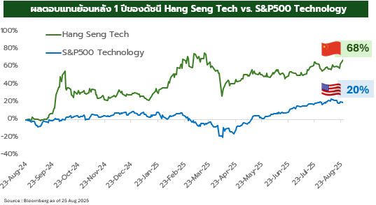 นักลงทุนหลายท่านอาจคุ้นเคยเป็นอย่างดีกับหุ้นเทคฯ สหรัฐฯ แต่รู้หรือไม่บริษัทเทคโนโลยีของจีนกำลังเติบโตอย่างก้าวกระโดดในช่วงที่ผ่านมาโดยเฉพาะปีนี้ ทำผลตอบแทนแซงหน้าหุ้นเทคฯ สหรัฐฯ ไปกว่า 3 เท่า!!! โดยในช่วง 1 ปีที่ผ่านมาดัชนี Hang Seng Tech ปรับตัวเพิ่มขึ้นกว่า 68% ขณะที่ดัชนี S&P500 Technology ปรับตัวเพิ่มขึ้นเพียง 20% เท่านั้น