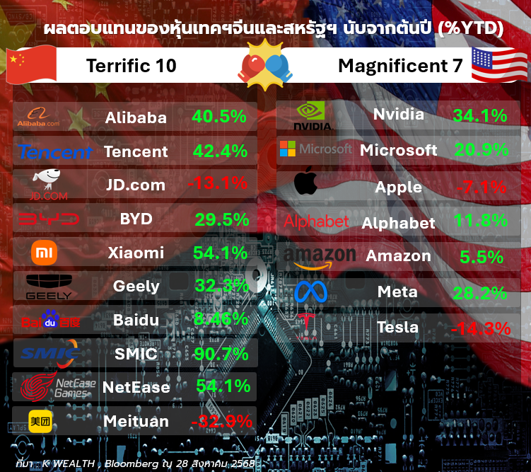 ถ้ามาดูผลตอบแทนในระดับหุ้นบิ๊กๆ รายตัวอย่างกลุ่ม 7 นางฟ้าของสหรัฐฯ (Magnificent 7) เทียบกับแก๊งค์ Terrific 10 ของจีน พี่จีนก็ชนะขาดลอยไปหลายตัว