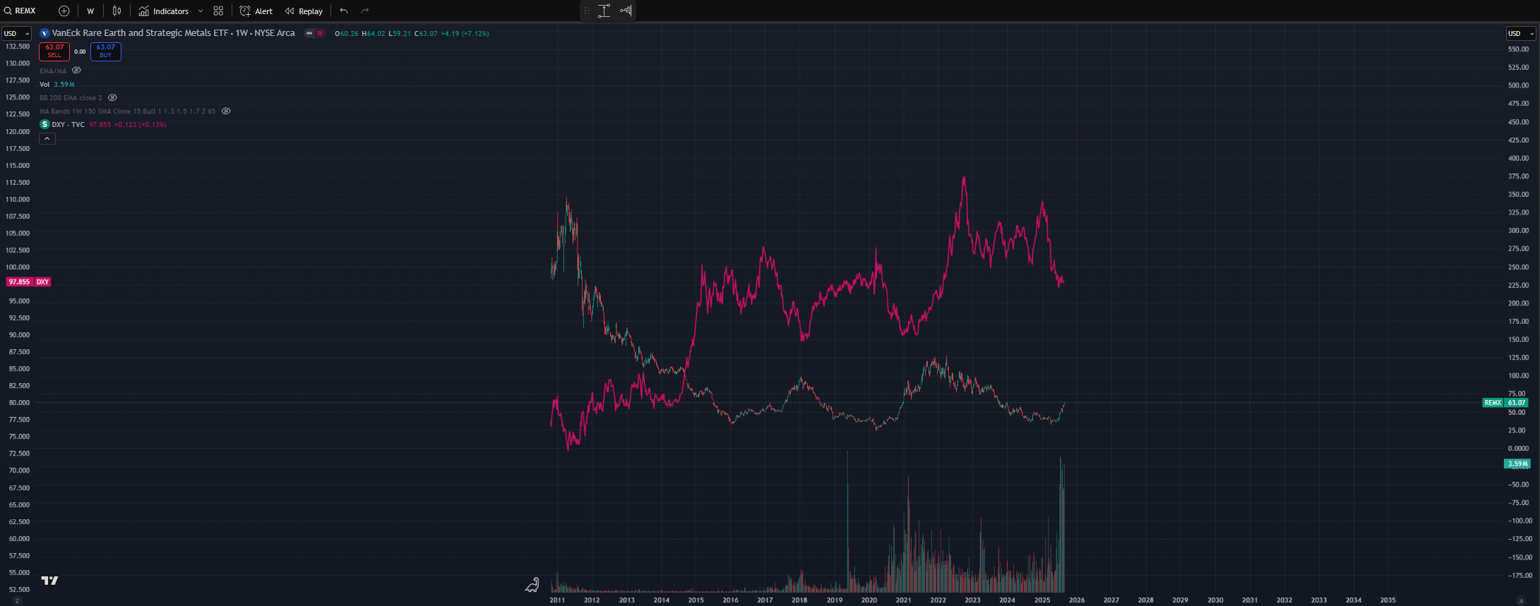 เนื่องจาก Rare Earth ยังถูกซื้อขายในสกุลเงินดอลลาร์เหมือน Commodity อื่นๆ จากภาพด้านบนจะเห็นว่า การเปลี่ยนแปลงของเงินดอลลาร์ (Dollar Index) มีความสัมพันธ์ผกผันอย่างชัดเจนกับผลตอบแทนของ VanEck Rare Earth and Strategic Metals ETF ดังนั้นถ้าอ้างอิงความสัมพันธ์ในอดีต การอ่อน/แข็งค่าของค่าเงินดอลลาร์จึงอาจเป็นปัจจัยหลักต่อผลตอบแทนของกองทุนนี้