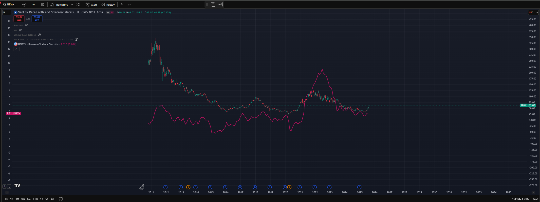 ผลตอบแทนในอดีตของ VanEck Rare Earth ETF นั้นมีความสัมพันธ์โดยตรงกับอัตราเงินเฟ้อของโลกและของสหรัฐฯ ซึ่งเป็นประเทศผู้บริโภคผลิตภัณฑ์ที่ใช้ Rare Earth เป็นส่วนประกอบ หมายความว่าหากเงินเฟ้อกลับมาเร่งตัวในช่วงเศรษฐกิจร้อนแรง ผลตอบแทนของกองทุนหลักก็อาจปรับเพิ่มขึ้นได้