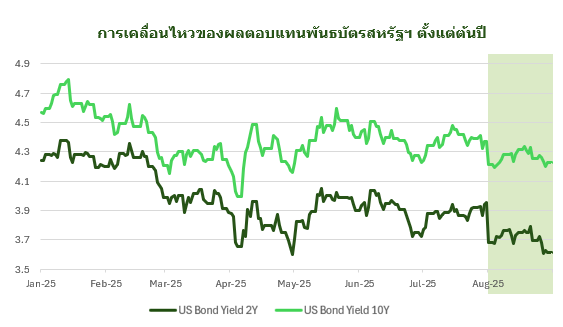 ในเดือนสิงหาคม 2568 อัตราผลตอบแทนพันธบัตรสหรัฐฯ ปรับตัวลดลง หลังประธาน Fed ส่งสัญญาณผ่อนคลายมากขึ้นที่งาน Jackson Hole และ กนง. มีมติปรับลดดอกเบี้ย 0.25% ส่งผลให้ Bond Yield ไทยปรับลดต่อเนื่อง
