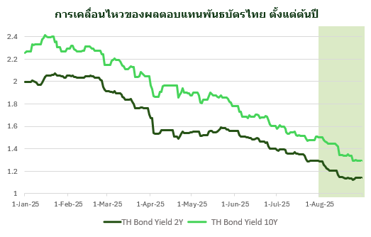 อัตราผลตอบแทนพันธบัตรไทย (TH Bond Yield) ในเดือน ส.ค. ปรับตัวลดลงต่อเนื่องตั้งแต่ต้นปี 2568