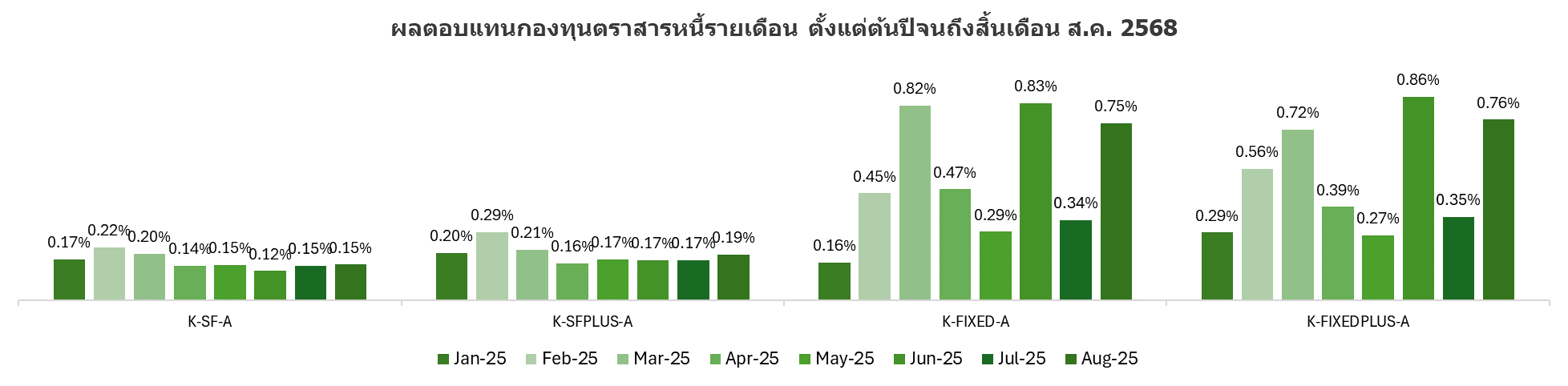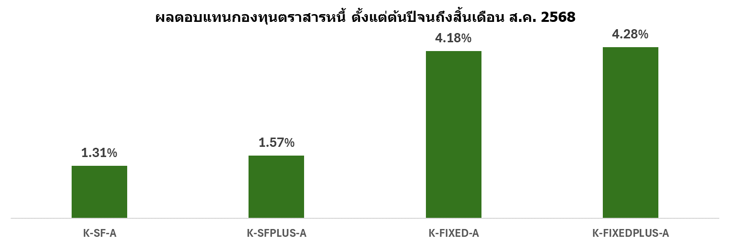 ท่ามกลางสภาพแวดล้อมที่เอื้อต่อตลาดตราสารหนี้ กองทุนตราสารหนี้ของกสิกรไทยยังคงทำผลตอบแทนที่แข็งแกร่งอย่างต่อเนื่อง โดยสามารถทำกำไรได้ติดต่อกัน 8 เดือน นับตั้งแต่ต้นปีถึงสิ้นเดือนส.ค. 2568 กองทุน K-SF-A +1.31%, K-SFPLUS-A +1.57%, K-FIXED-A +4.18% และ K-FIXEDPLUS-A +4.28%