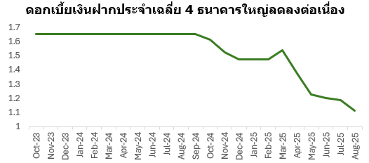 หลังการปรับลดดอกเบี้ยครั้งทึ่ 3 ของไทยในปีนี้ สิ่งที่นักลงทุนสัมผัสได้ชัดเจนที่สุดคือ ผลตอบแทนจากเงินฝากที่ลดลงอย่างต่อเนื่อง ทั้งเงินฝากประจำและบัญชีออมทรัพย์ของธนาคารต่าง ๆ ที่เริ่มทยอยปรับลดดอกเบี้ยตามดอกเบี้ยนโยบายของไทย โดยปัจจุบัน อัตราดอกเบี้ยเงินฝากประจำ 1 ปีของ 4 ธนาคารใหญ่ ลดลงจาก 1.475% เมื่อต้นปี เหลือเพียง 1.11% ณ สิ้นเดือนสิงหาคม ขณะที่นักลงทุนใน Term Fund ก็เผชิญแนวโน้มเดียวกัน เนื่องจากดอกเบี้ยที่ได้รับมีโอกาสปรับลดลงต่อ