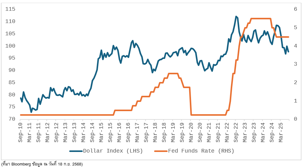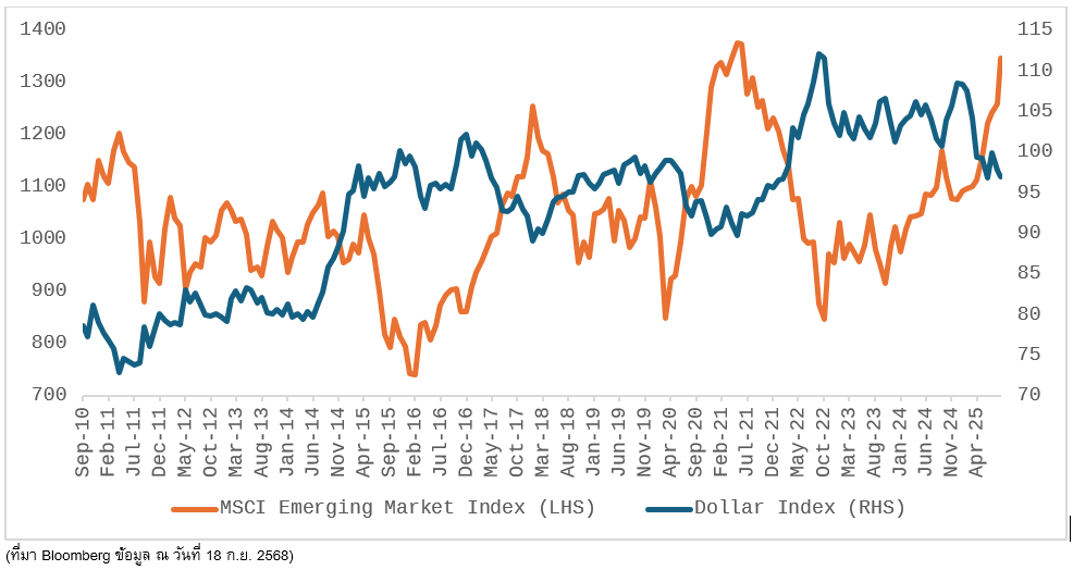 เมื่อดอลลาร์อ่อน (ช่วง Fed หั่นดอกเบี้ย) → EM มัก outperform เนื่องจากได้แรงหนุนจากกระแสเงินทุนต่างชาติไหลเข้า และค่าเงินท้องถิ่นมีเสถียรภาพมากขึ้น